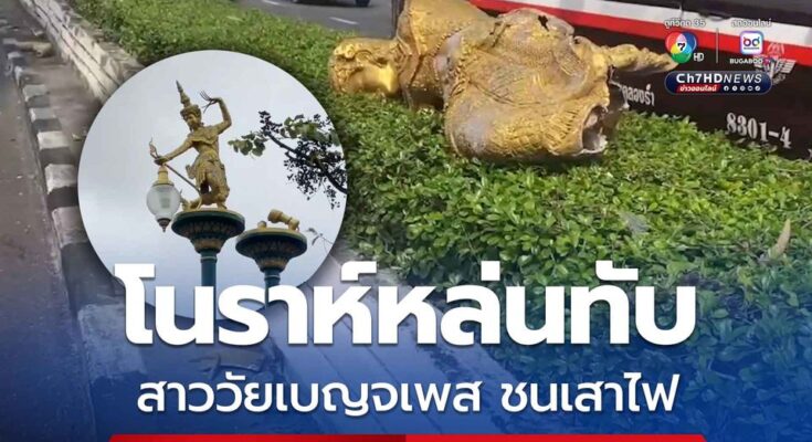 สาววัยเบญจเพส ขี่จักรยานยนต์พุ่งชนเสาไฟเกาะกลางถนน ตัวมโนราห์ประดับหล่นทับบาดเจ็บ ภาพจากกล้องวงจรปิดนาทีเกิดเหตุ รถขับมาเร็ว เสียหลักขณะเข้าโค้ง