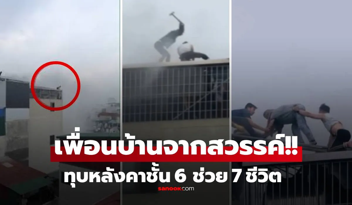 เปิดภาพ 2 ชายเสี่ยงชีวิต ทุบหลังคาช่วยเพื่อนบ้านหนีไฟไหม้บ้าน 6 ชั้น