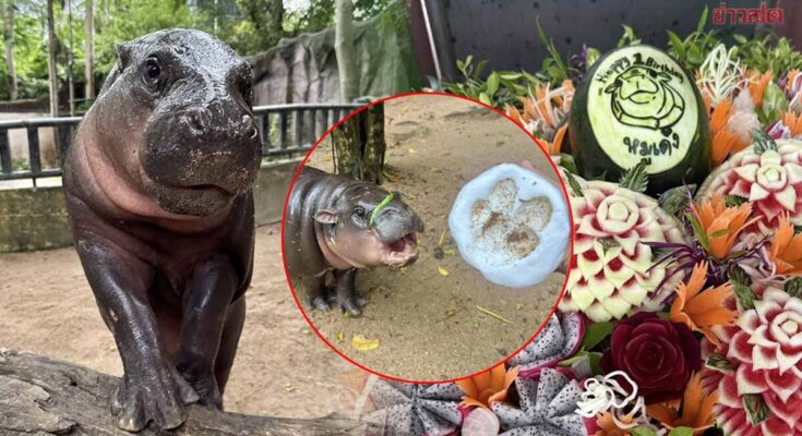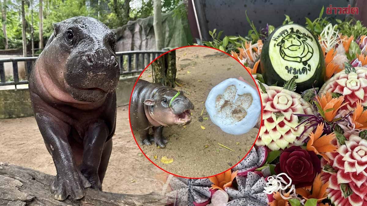 สวนสัตว์เปิดเขาเขียว เสิร์ฟเค้กผลไม้รวมชุดใหญ่แกะสลักสวยงาม มอบให้เป็นของขวัญวันเกิดหมูเด้ง อลังการสมฐานะคุณหนูแห่งตระกูลฮิปโปแคระ