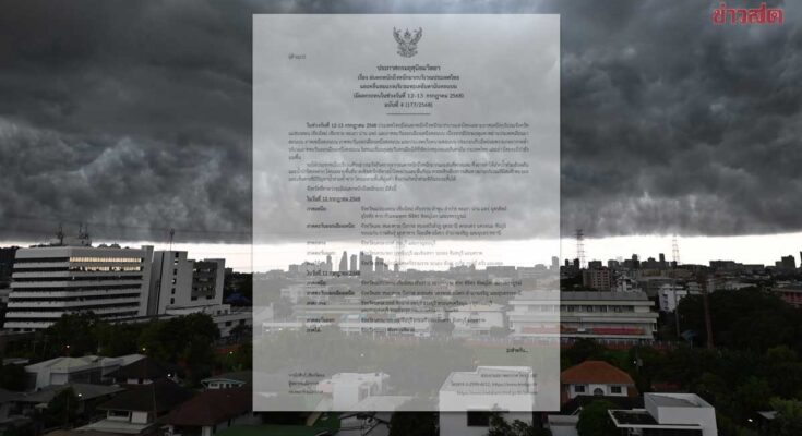 ประกาศ ณ วันที่ 12 กรกฎาคม พ.ศ. 2568 เวลา 05.00 น. ทั้งนี้ กรมอุตุนิยมวิทยาจะออกประกาศฉบับต่อไปในวันที่ 12 กรกฎาคม พ.ศ. 2568 เวลา 17.00 น