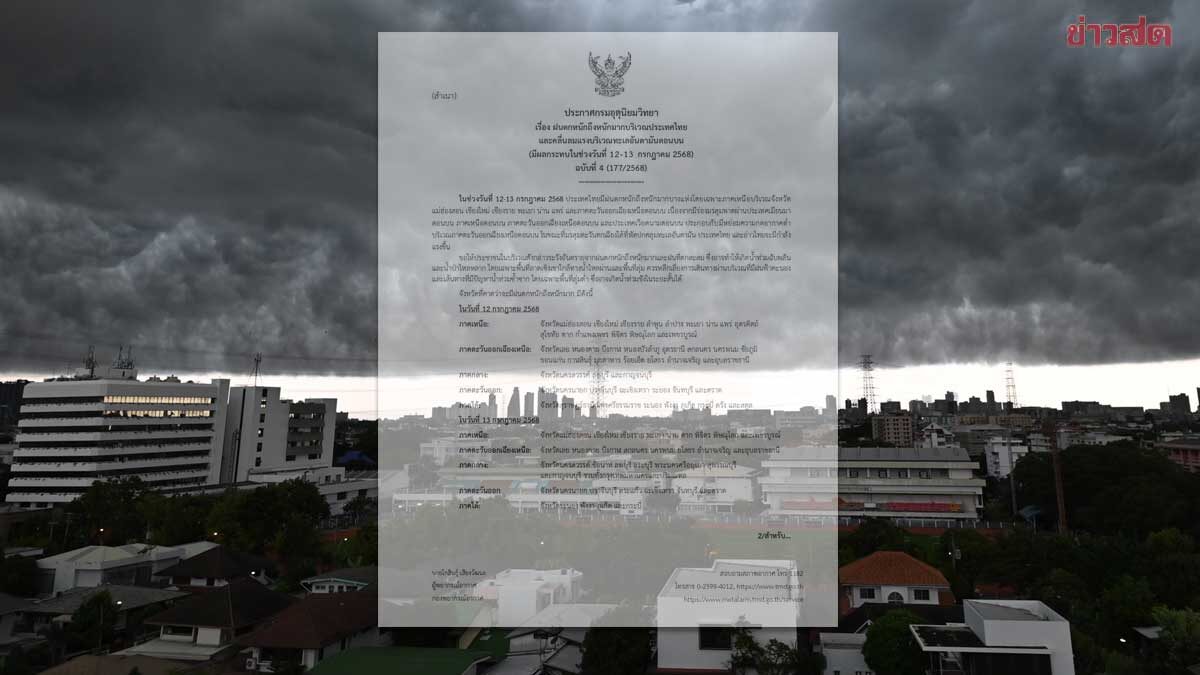 วันที่ 12 ก.ค.2568 กรมอุตุนิยมวิทยา ประกาศ เรื่อง ฝนตกหนักถึงหนักมากบริเวณประเทศไทย และคลื่นลมแรงบริเวณทะเลอันดามันตอนบน (มีผลกระทบในช่วงวันที่ 12-13 กรกฎาคม 2568) ฉบับที่ 4 (177/2568) ระบุว่า
