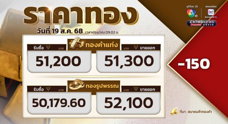 ราคาทอง โดยสมาคมค้าทองคำ รายงานราคาทองวันนี้ (19 ส.ค. 68) เปิดตลาดราคาทองปรับลง 150 บาท ขายออกที่บาทละ 51,300 บาท โดยทองคำแท่งรับซื้อที่ 51,200 บาท ขายออกที่ 51,300 บาท ทองรูปพรรณรับซื้อที่ 50,179.60 บาท ขายออก 52,100 บาท